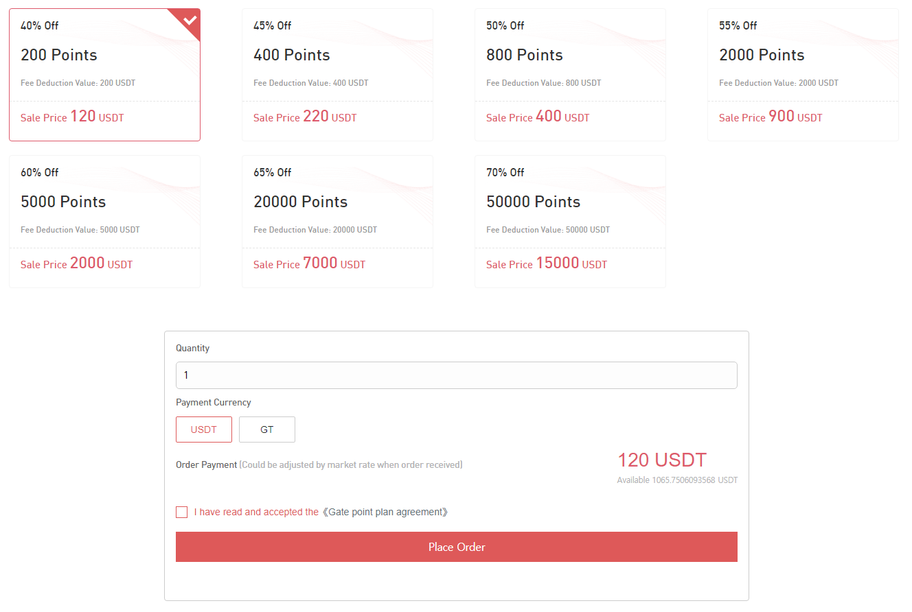 Ex) 200 Gate Point를 120 USDT로 구매 후 거래시 200 USDT 만큼 수수료를 지불하지 않고 거래할 수 있습니다.
