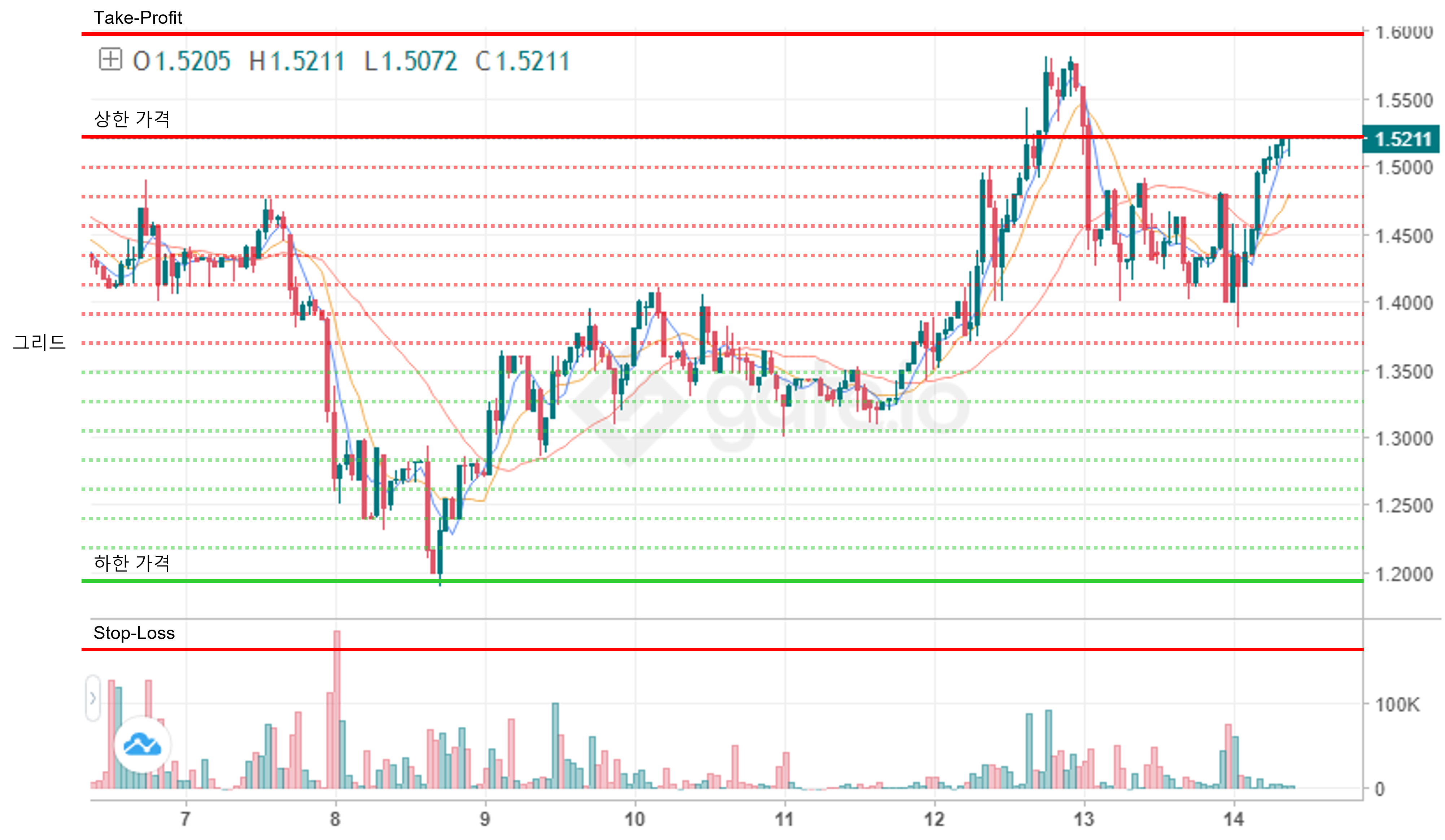 그리드 트레이딩의 기본 메커니즘은 현재 가격 기준으로 상단, 하단을 설정하고