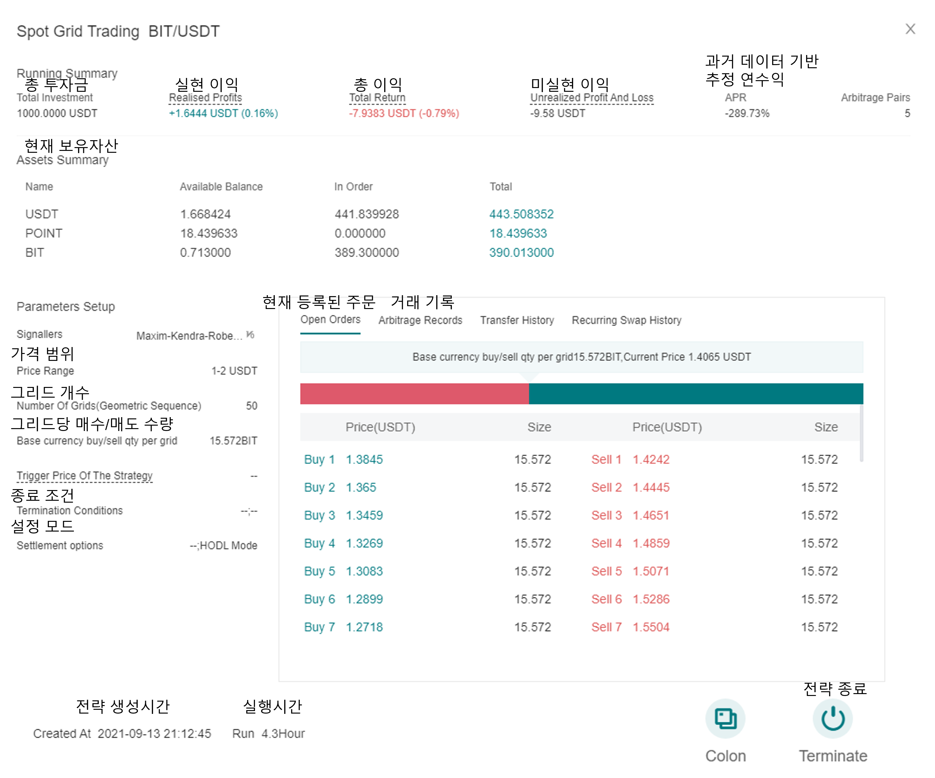 위에서 설명한 값들을 설정한 후 Create 버튼을 누르면 그리드 트레이딩이 진행됩니다.