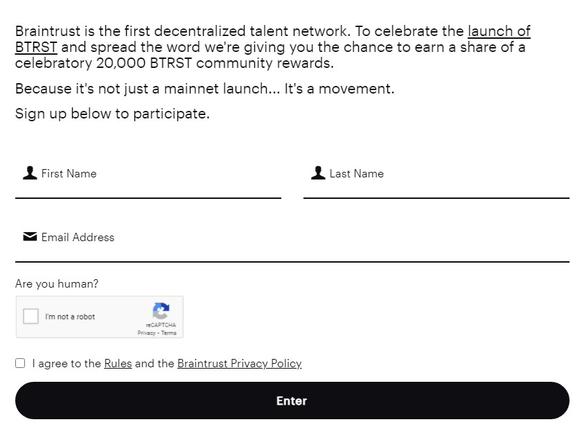 Braintrust is the first decentralized talent network. To celebrate the launch of BTRST and spread the word we're giving you the chance to earn a share of a celebratory 20,000 BTRST community rewards. Because it's not just a mainnet launch... It's a moveme