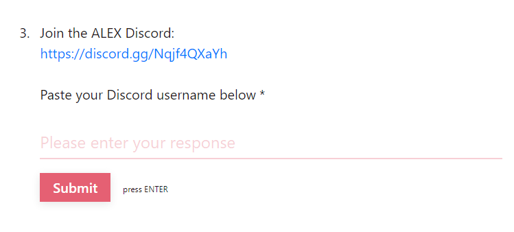 3. ALEX 디스코드에 가입한 후 디스코드 유저네임을 기입합니다. 디스코드 닉네임은 xxx#123 과 같은 형식입니다.