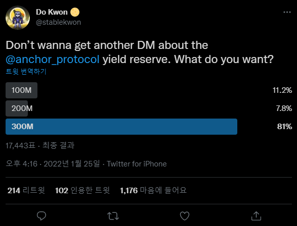 또한 2022. 01. 25 Do Kwon은 LFG의 기금의 약10%에 해당하는 3억달러를 Anchor 적립금에 추가하려는듯한 트위터 투표를 진행하였습니다.