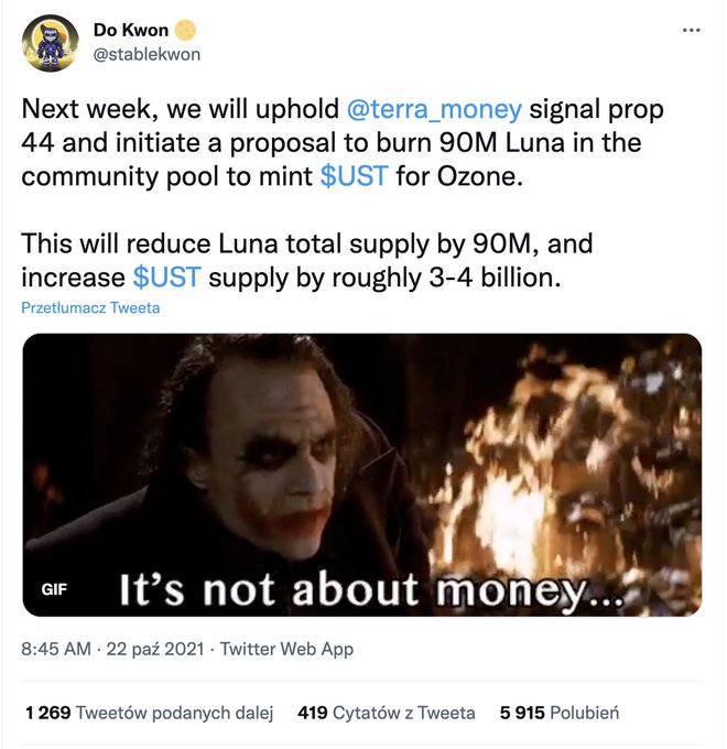 “Next week, we will uphold @terra_money signal prop 44 and initiate a proposal to burn 90M Luna in the community pool to mint $UST for Ozone. This will reduce Luna total supply by 90M, and increase $UST supply by roughly 3-4 billion. https://t.co/Wahn9IW