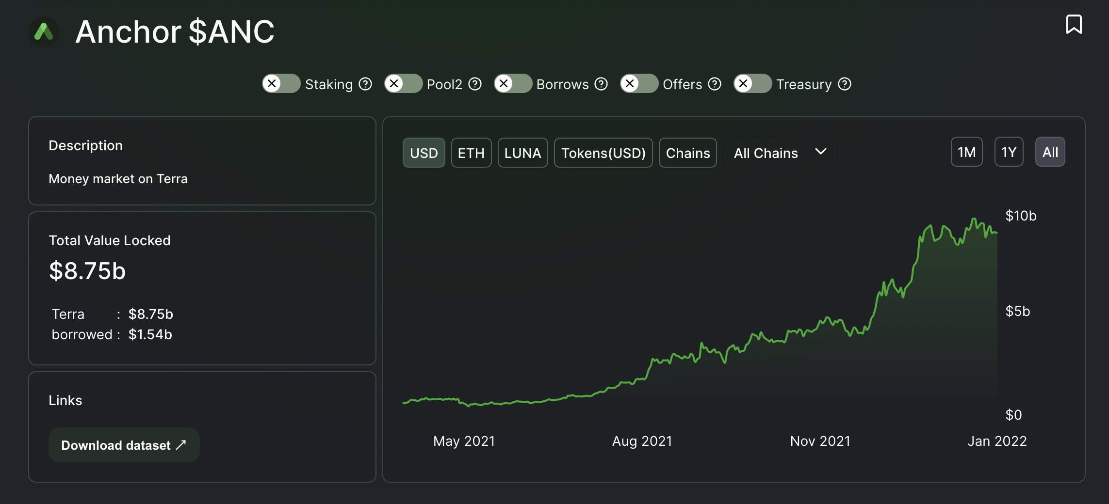 현재, 가장 큰 UST 수요를 발생시키는 프로토콜은 Anchor Protocol 이며, 이는 100억 UST 이상의 TVL을 갖고 있습니다.