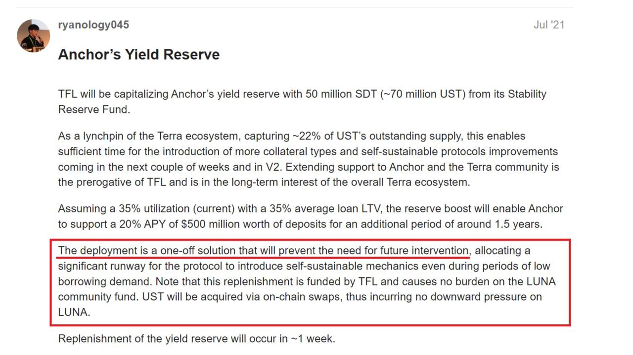 일회성 조치라는 약속을 덧붙이며, 적립금 잔고에 7,000만 UST를 Anchor 예치하였습니다.