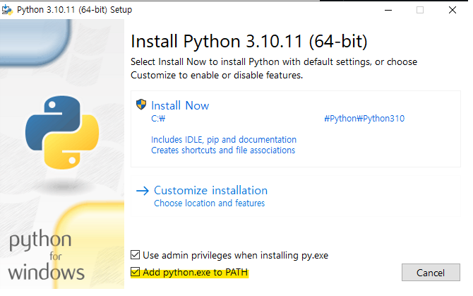 파이썬을 설치한다 (아래 path 체크 안 하면 수동으로 환경변수 등록해줘야됨)